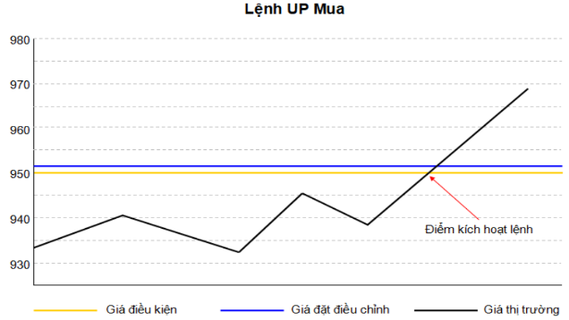 Khách hàng đang sở hữu 01 vị thế Bán, giá thị trường đang là 945, Khách hàng đặt 1 lệnh điều kiện UP - Mua với mục đích cắt lỗ với giá điều kiện 950 và Giá đặt điều chỉnh là 951 (biên trượt 1). Giá thị trường biến động đến khi chạm mức 950 (bằng mức giá điều kiện) thì lệnh Mua LO với giá 951 sẽ được hệ thống kích hoạt và đẩy vào sàn giao dịch.