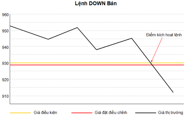 Khách hàng đang sở hữu 01 vị thế Mua, giá thị trường đang là 950, Khách hàng đặt 1 lệnh điều kiện DOWN - Bán với mục đích cắt lỗ với giá điều kiện 930 và Giá đặt điều chỉnh là 929 (biên trượt 1). Giá thị trường biến động đến khi chạm mức 930 (bằng mức giá điều kiện) thì lệnh Bán LO với giá 929 sẽ được hệ thống kích hoạt và đẩy vào sàn giao dịch.