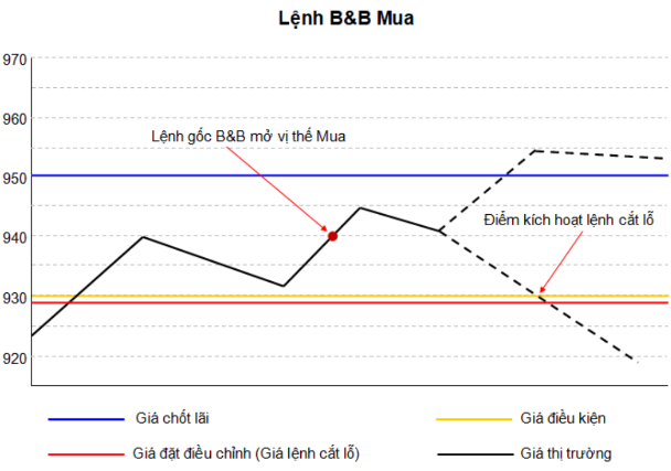 - Ví dụ minh họa: Khách hàng đặt lệnh B&B Mua với khối lượng 4 và giá 940. Khách hàng đặt Khoảng lãi là 10 (cho lệnh chốt lãi), Khoảng lỗ là 10 và Biên trượt là 1 (cho lệnh cắt lỗ). Sau khi lệnh gốc B&B mua 4 hợp đồng với giá 940 được khớp hoàn toàn thì lệnh chốt lãi được gửi lên Sở giao dịch với khối lượng 4 và giá 950 (Giá chốt lãi).