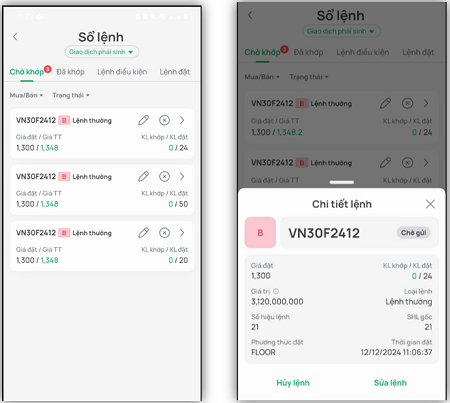 Khi lệnh ở trạng thái chưa được khớp hết, khách hàng có thể tiến hành hủy lệnh/sửa lệnh tại màn hình Lệnh chờ khớp.