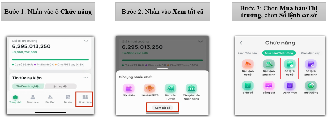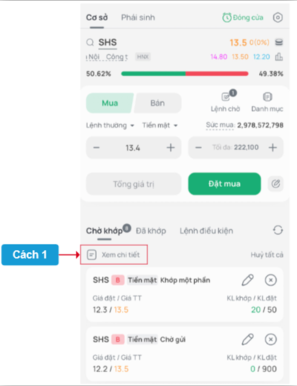 Khách hàng có thể xem chi tiết các lệnh chờ khớp tại màn hình Đặt lệnh hoặc xem tại Sổ lệnh cơ sở. Có thể mở sổ lệnh lên bằng 2 cách: