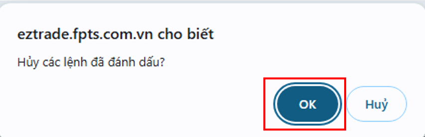 - Màn hình hiện ra thông báo "Hủy các lệnh đã đánh dấu?" để Khách hàng xác nhận việc thực hiện hủy lệnh