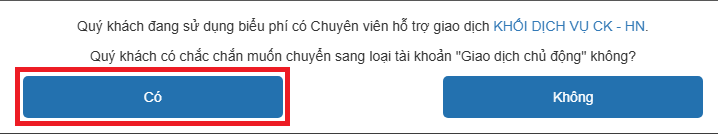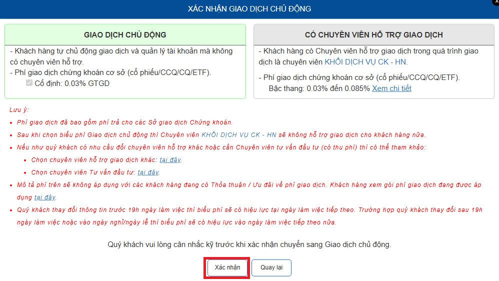 Quý khách nhấn Xác nhận để lựa chọn hình thức Giao dịch chủ động và hưởng mức phí cố định (đã bao gồm phí trả Sở Giao dịch chứng khoán)